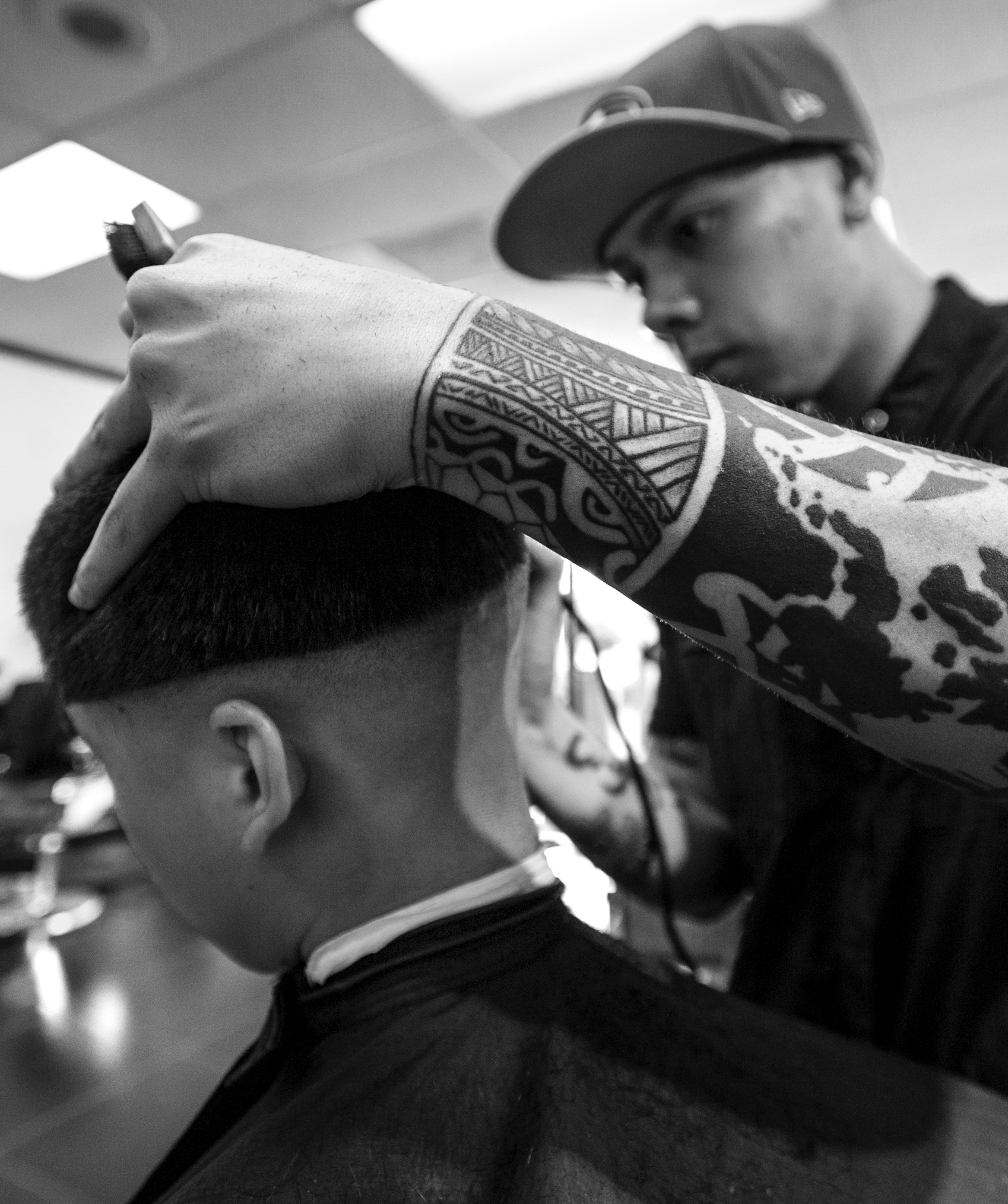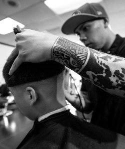 Barber Michael Antonio gives Tyler Nguyen a haircut at barbershop The Cutlery on 417 Gellert Blvd in Daly City, CA. Most of the barbers at the barbershop have tattoos. Photo by Benjamin Kamps / Xpress