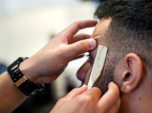 Barber Kavin Nacor uses a straight razor to trim Jad Ghishan’s beard at barbershop The Cutlery on 417 Gellert Blvd in Daly City, CA. Photo by Benjamin Kamps / Xpress