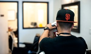 Barber Kavin Nacor gives Jad Ghishan a haircut at barbershop The Cutlery on 417 Gellert Blvd in Daly City, CA. Photo by Benjamin Kamps / Xpress
