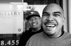 Barbers Jason Pulido (front) and Jason Gragasin (back) are equal partners. They own barbershop The Cutlery on 417 Gellert Blvd in Daly City, CA. Photo by Benjamin Kamps / Xpress
