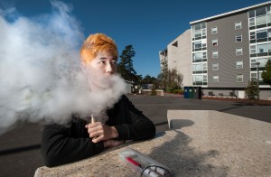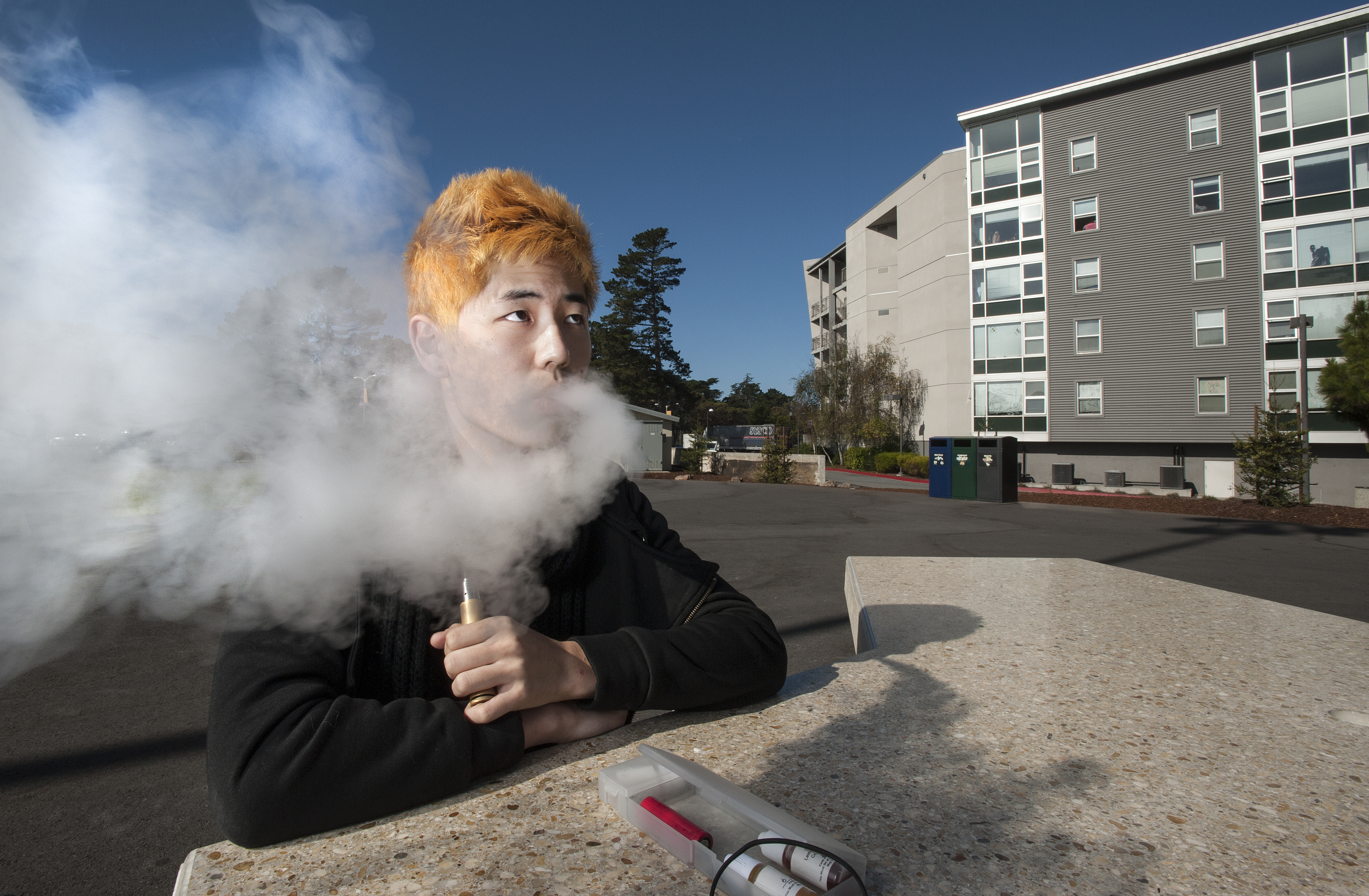 SF State student Andrew Yu uses a vape pen at a pinic table to the back of the humanities building. Photo by Benjamin Kamps / Xpress