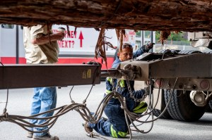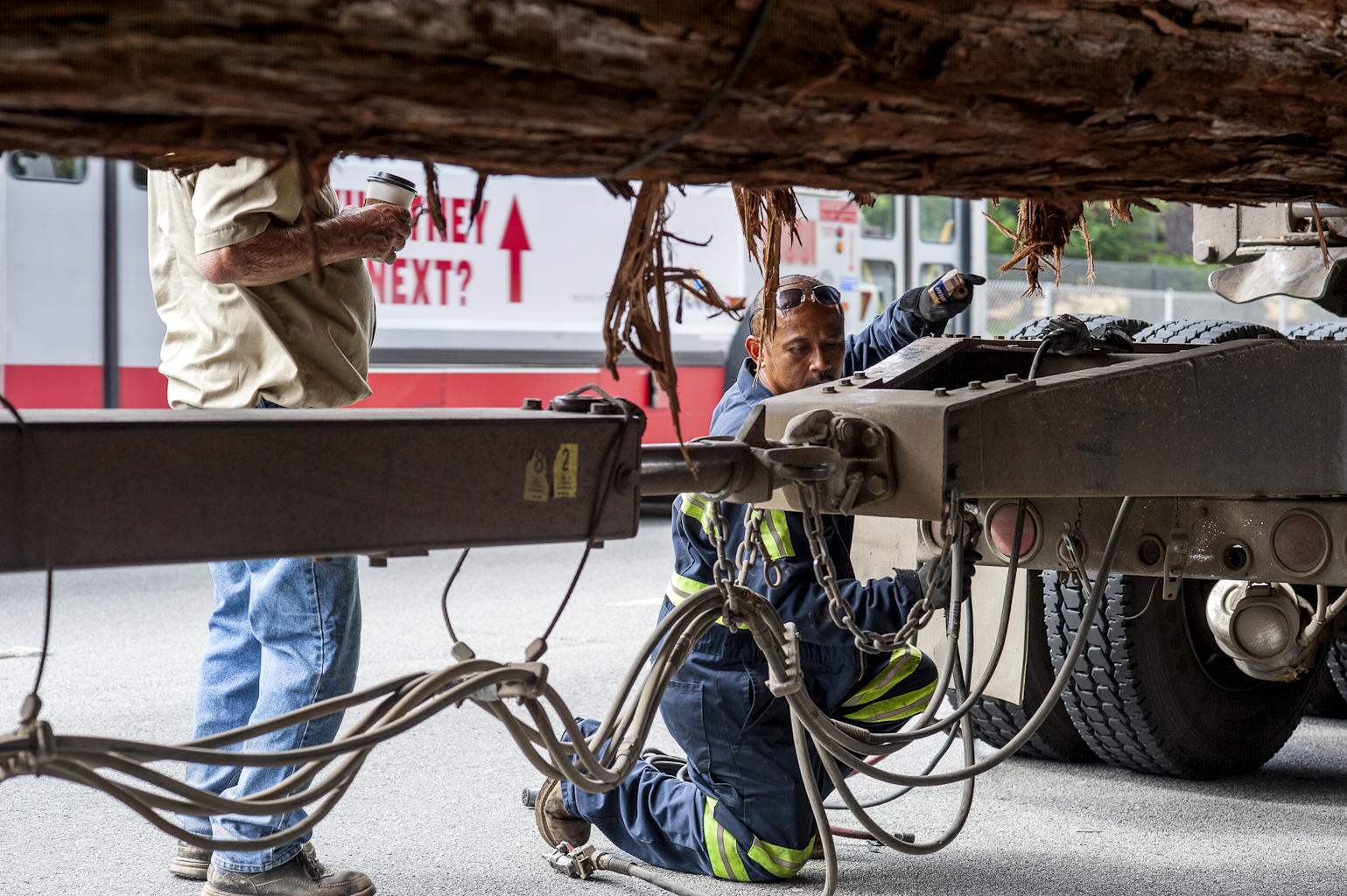 Tony David and Percy Leighton preparing to tow Leightons truck after it broke down on 19th Avenue, San Francisco, CA. Making it impossible for him to drop off his load of lumber in Concord, CA on Wednesday, September 11, 2013