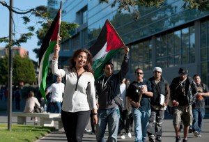 A procession, holding up flags, makes it’s way to North Plaza at a rally to celebrate the Palestinian Cultural Mural: Honoring Dr. Edward Said on the Cesar Chavez Student Center. The first part of the rally was held at Malcolm X Plaza after which a procession led to the mural on North Plaza Thursday, Nov. 7, 2013 Photo by Benjamin Kamps / Xpress