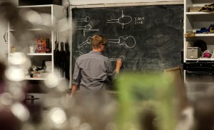 Cynthia Skovlin writing down different steps of the glass blowing process on a chalkboard in the glass blowing room of the Fine Arts buidling at SF State in San Francisco, CA. Tuesday, september 17th, 2013.