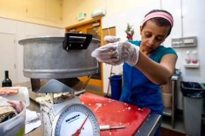 Eji Atlaw weighs onions for her spicy lentil dish at La Cocina on 2948 Folsom Street in San Francisco.